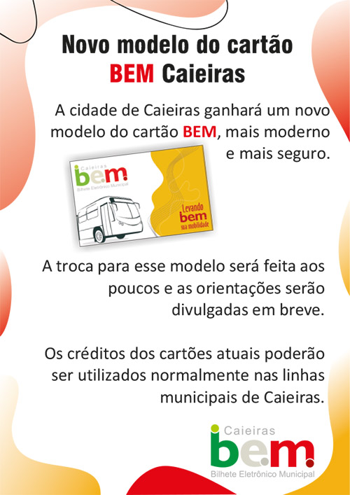 Bem-vindo ao BEM (Bilhete Eletrônico Municipal), um meio de pagamento que utiliza cartão, o qual armazena créditos eletrônicos para serem utilizados no pagamento das tarifas nos veículos do sistema de transporte coletivo municipal de Caieiras.